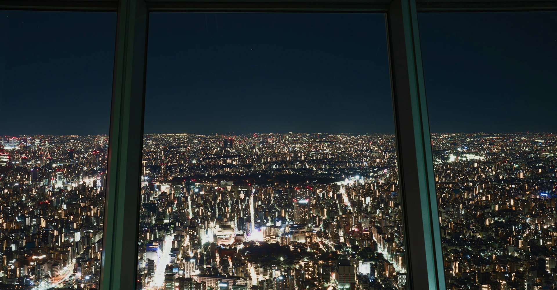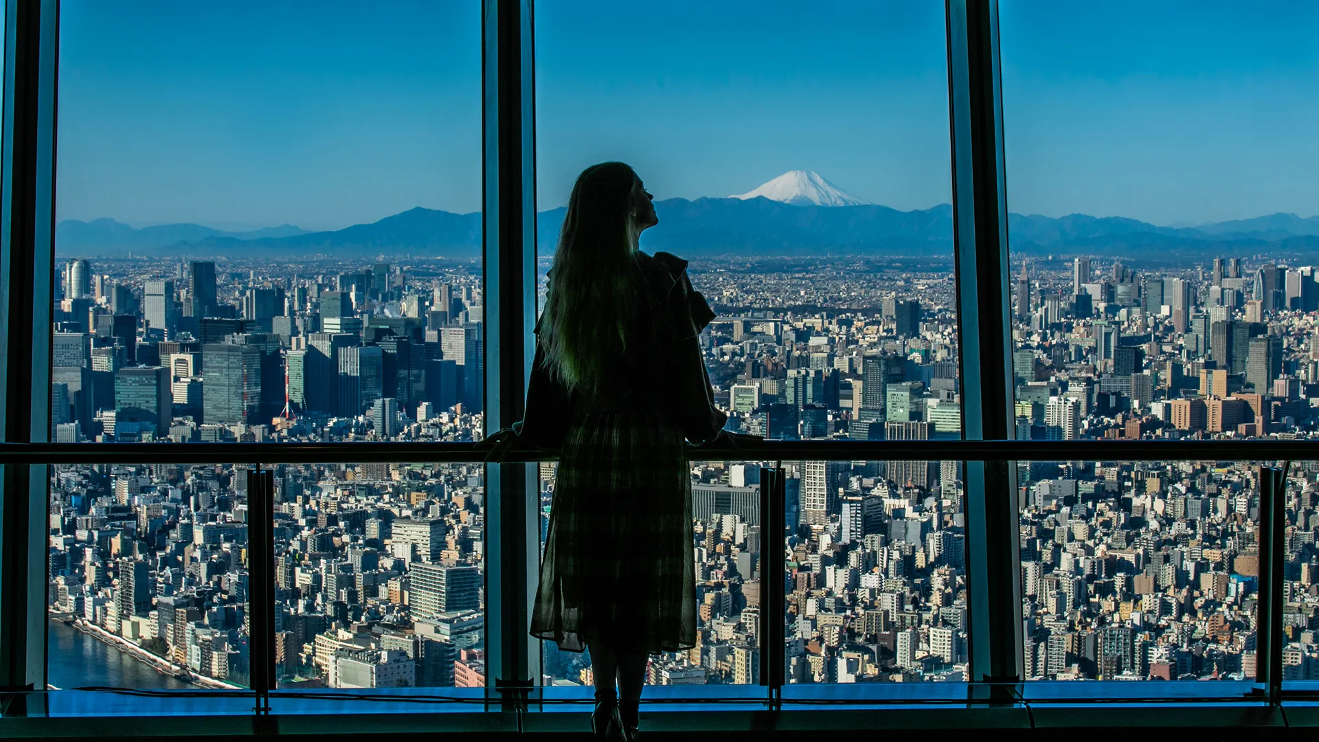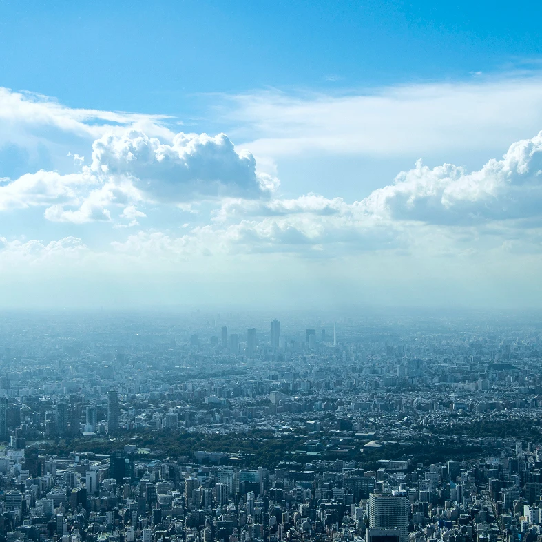 東京の街並みを見渡す大パノラマ。晴れた日には富士山まで望め、カフェのドリンク片手に絶景を楽しめます。