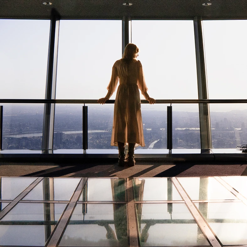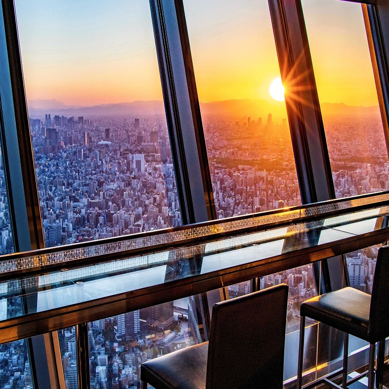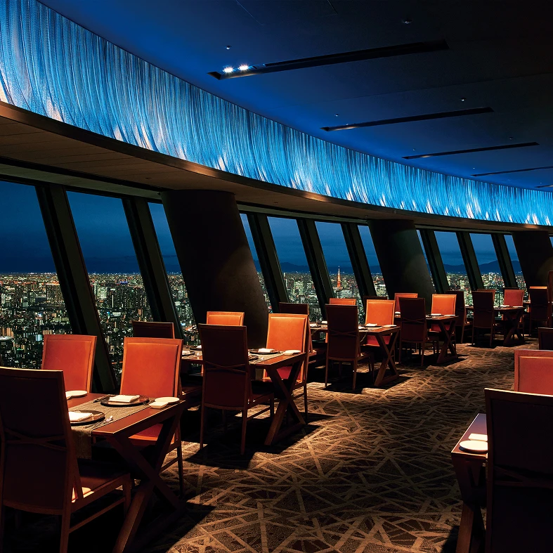 大きな窓から東京の街並みを一望。レストランやショップもそろい、景色とともに特別な時間を楽しめます。