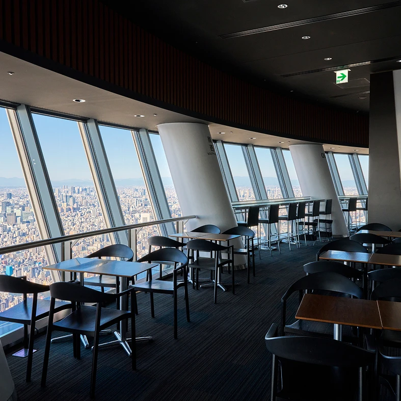 ガラス床から足元まで広がる東京の景色を体感。カフェでくつろぎながら、空の上のひとときを楽しめます。