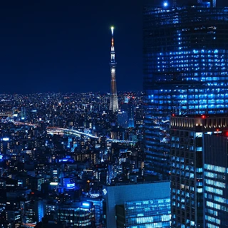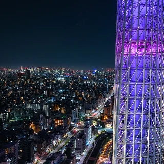 江戸紫をまとった、優美で雅やかなライティング。日本の伝統色である江戸紫が、夜空に上品な華やかさを添えます。粋とは対照的な、艶やかで気品ある光の表情が、東京の夜景に深みを与えます。