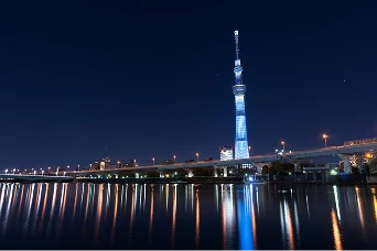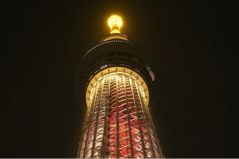 江戸の「心意気」を表現した、粋で洗練されたライティング。淡いブルーの光が、隅田川の水面を思わせる清涼感を演出します。シンプルでありながら、凛とした美しさを放つ、スカイツリーの基調となる光です。