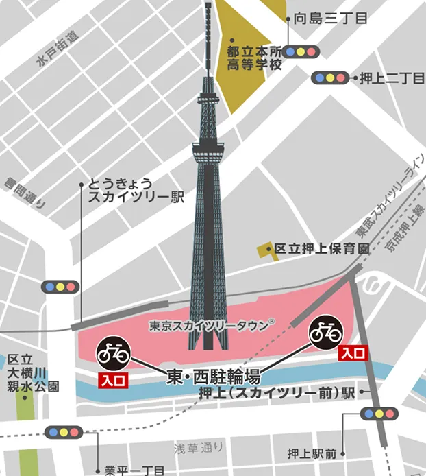 とうきょうスカイツリー駅側・押上駅側、東京スカイツリータウンの東西2か所に有料駐輪場をご用意しています。