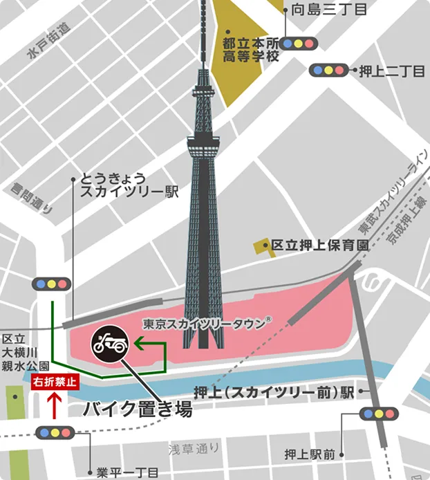 東京スカイツリータウンにバイク専用の有料駐輪場をご用意しています。