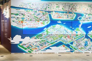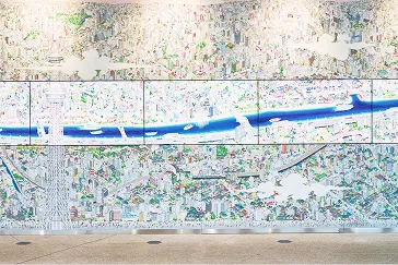 東京の営みや風物をいきいきと描いた壁画と13枚の映像モニターがシンクロしながら表現し、地域のコミュニティと文化を紹介します。