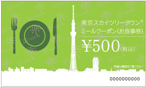 東京ソラマチに掲載されている店舗(一部除外店あり)、東京スカイツリー展望台内 SKYTREE CAFE(フロア350・340)、5F SKYTREE SHOPでご利用いただける500円(税込み)の食事券です。