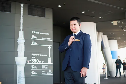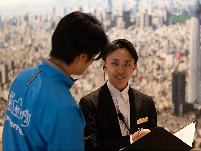 お客様一人ひとりが、安全かつ安心に展望台で過ごしていただけるよう、日々の運営管理を行っています。お客様に寄り添った館内サービスの向上施策、イベントや特別営業時の運営対応、展望台の現場スタッフの教育など、日々のオペレーション業務を最前線で支えています。