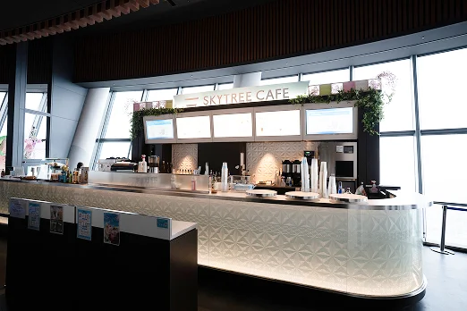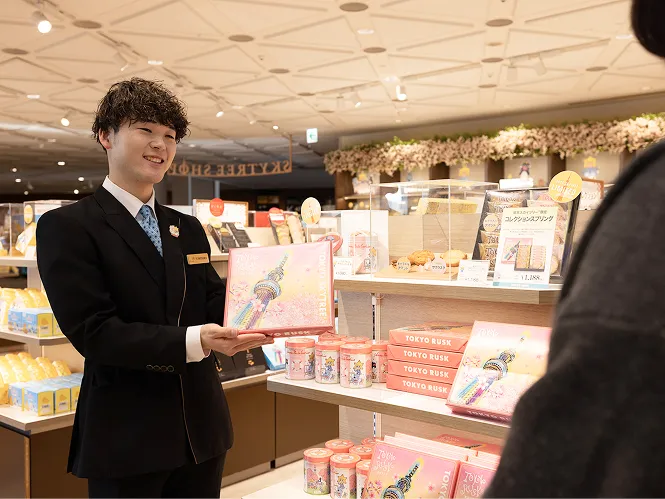 東京スカイツリーオフィシャルショップやカフェの運営・管理を行っています。お客様に「東京スカイツリーの思い出」を形としてお持ち帰りいただくため、オリジナル商品の企画・開発や売場づくり、接客サービスの向上などに取り組んでいます。また、店舗・飲食事業を通じて、東京スカイツリー全体の収益向上に直接貢献しています。