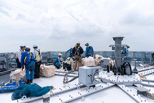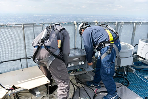 東京スカイツリーの観光事業と並ぶもう一つの柱である電波塔事業。社会を支えるインフラとして、世界有数の高さを誇る自立式電波塔の設備保守・管理を行い、放送や通信といった分野で人々の日常を支えています。また、その高さを活かした研究・観測拠点としての活用や電波塔としての賃貸事業にも携わり、技術の力で東京スカイツリーの価値と未来を広げる役割を担っています。
